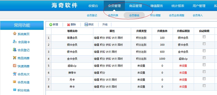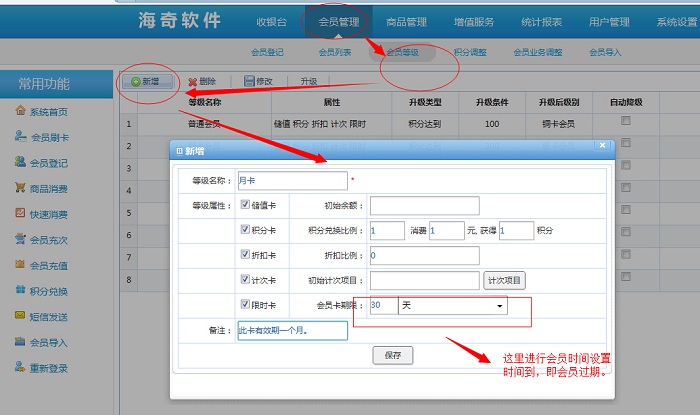 那么利用海奇会员管理系统如何来设置限时卡、月卡、年卡呢?