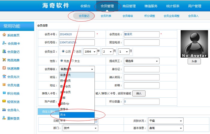 最后,进行会员登记,选择会员卡类型,这里选择的是月卡。