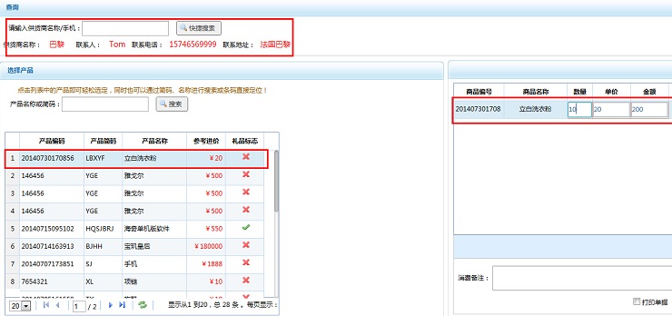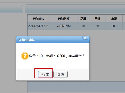 2.找到商品管理主菜单,然后点击商品进货。首先选择供货商,然后在商品列表中选择要进货的商品并双击进入待进货列表。双击数量可以进行进货数量修改,这里进货10瓶立白洗衣粉。