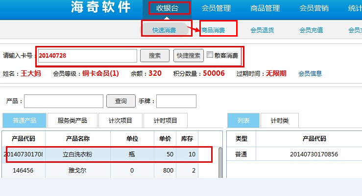 点击收银台,选择该菜单下商品消费,选择消费会员,会员所消费的产品,双击右侧产品列表数量下面的数字即可修改所消费产品数量。