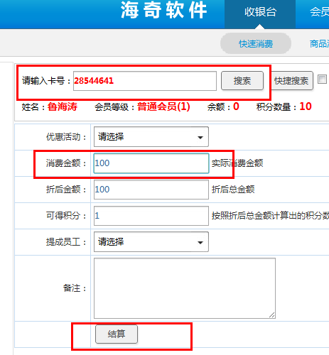 输入卡号、输入消费金额,点击结算,即可快速消费。