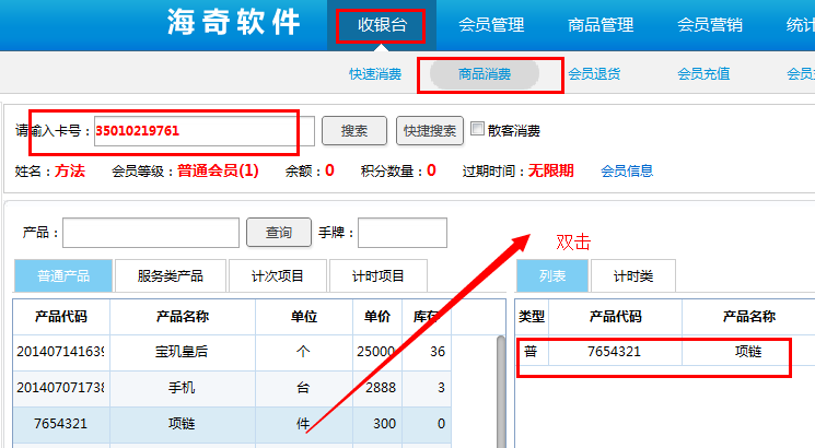 会员读卡(刷卡、输入卡号、姓名、手机号)进入,调出该会员信息。输入产品编号、产品名称或扫描枪扫条形码,从而调出该产品信息,鼠标双击该产品进入待消费状态。如下图: