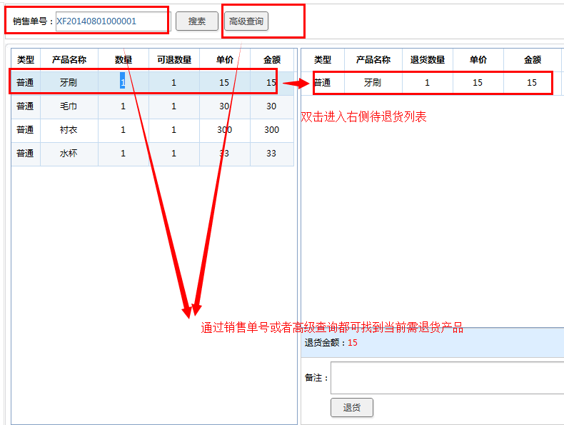 鼠标点击主菜单收银台下面的会员退货,在销售单号中填写会员消费的”消费单据”号(或是通过右侧的高级查询也可找到当前消费单据),即可显示当前单据所消费的产品,双击所要退货的产品进入右侧待退货列表,最后点击”退货”即可完成此商品的退货。如下图: