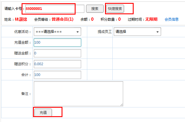 通过输入会员卡号或是右侧快捷搜索找到当前需充值会员,然后填写充值金额,点击”充值按钮”,即可完成充值。如下图: