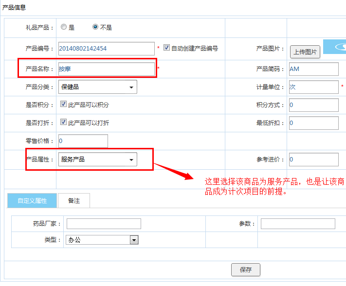 首先,需要添加计次项目,在商品添加中即可完成,在选择商品属性的时候,选择该商品为服务产品即可。这里添加一个”按摩”,选择该商品为服务产品,如下图: