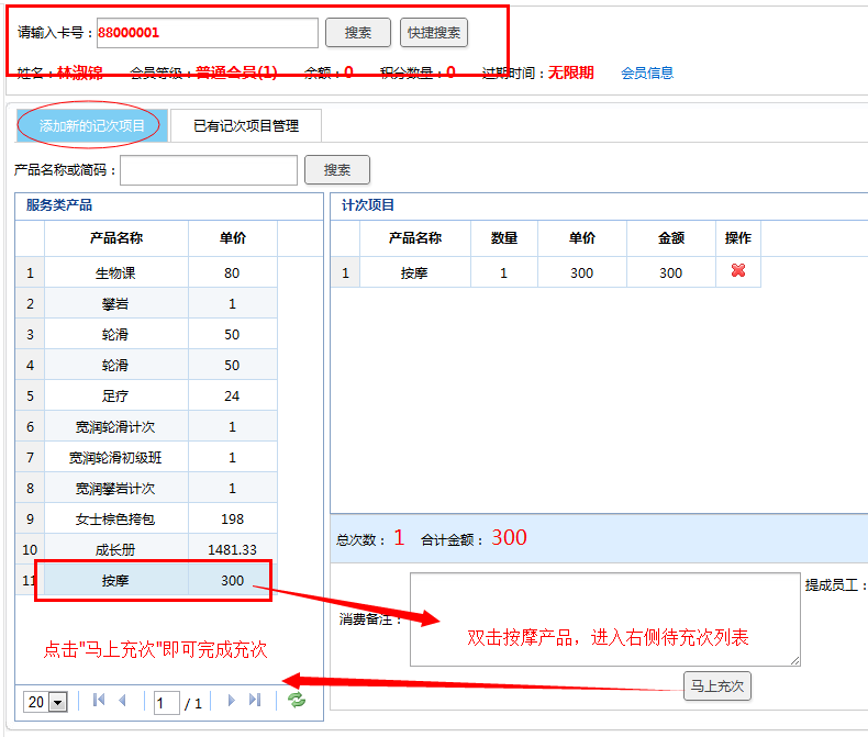 会员充次:可直接对会员充次消费项目的次数进行增加。