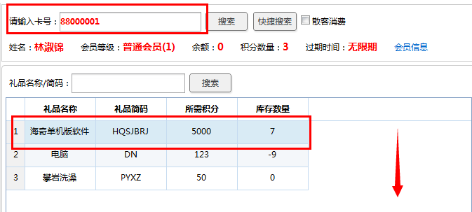 首先输入会员卡好或是通过快捷搜索找到会员,然后双击下面礼品表中所需兑换的礼品,此时兑换进入右侧待兑换列表,双击””兑换数量”下面的数字可修改兑换数量。如下图: