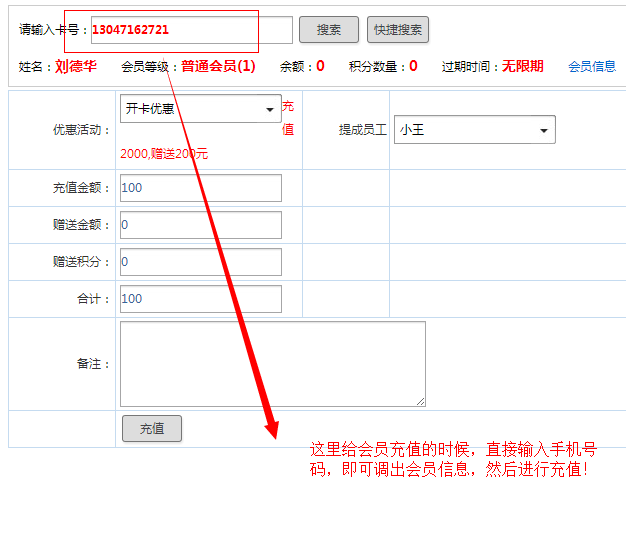 2.会员充值,在“请输入卡号”输入会员手机号,即可调出会员信息,然后输入充值金额,点击充值即可。