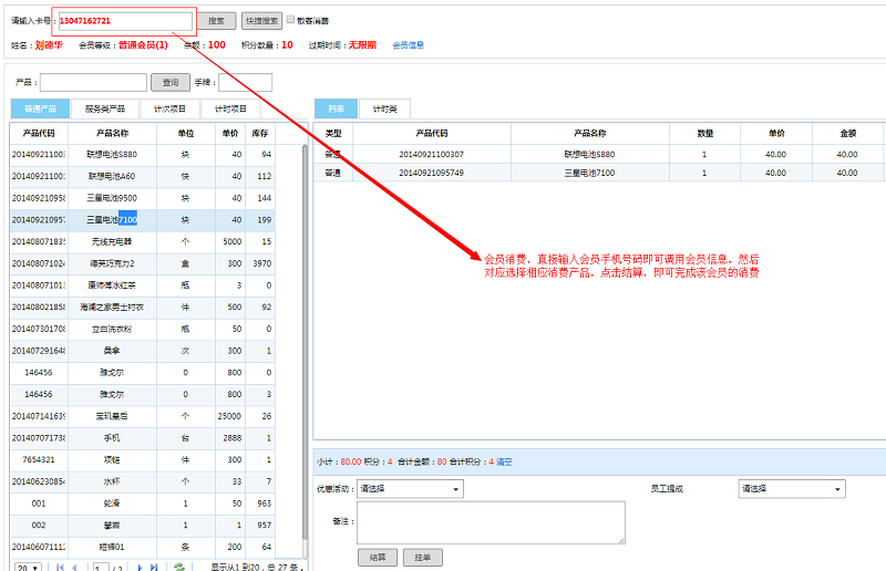 3.会员消费,在输入会员卡号的地方直接输入"会员手机号码",即可调出会员信息,然后选择对应消费产品,点击结算,即可完成该会员的消费