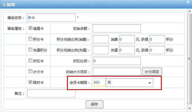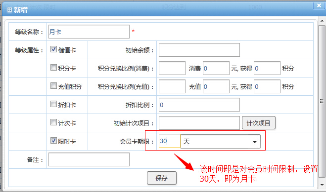 1.找到会员管理-会员等级,点击添加,如图:,等级名称可由商家自行设定,会员卡期限即时对该会员等级的时间限制,月卡即设置为30天,年卡设置为365年。