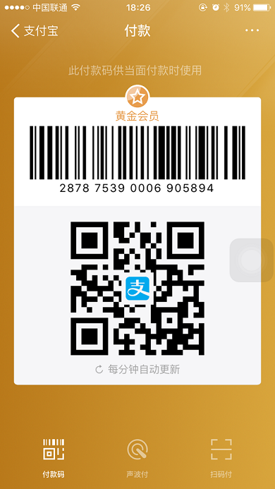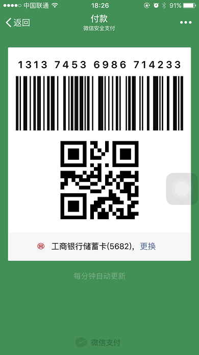 第一步:打开微信钱包/支付宝付款码,出示给商家,如图: