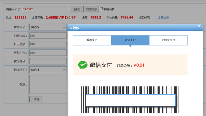 第二部:用连接海奇会员管理系统的扫码枪扫一下此条形码即可完成订单结算,此时会员会收到扣款通知,海奇会员管理系统中会显示结算成功,如图: