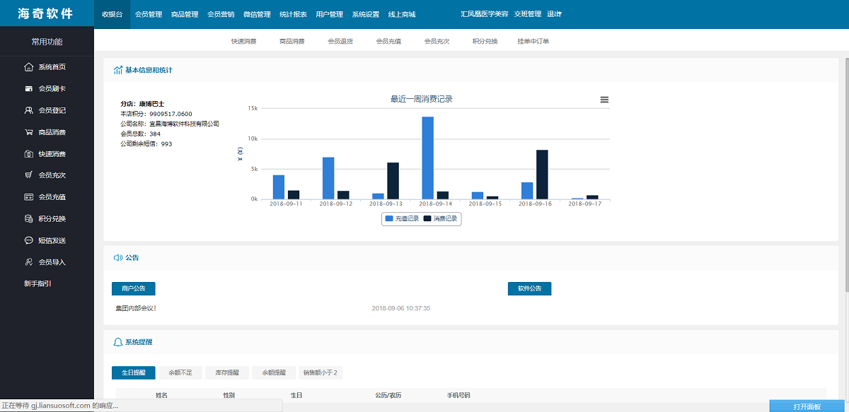 在今天2018年9月17日,海奇会员管理系统(http://gj.liansuosoft.com,试用账号—企业代码:hq456 账号:admin 密码:123456)做出了重大升级! 海奇会员系统界面进行了全面升级调整,更新后的界面更加清新自然、采用了扁平化轻量级设计,使得整个界面看起来更加轻松。 以前的系统界面采用的是表格化框架,是多年前的设计风格,在现在看来非常臃肿落后;经过升级后的界面更加符合现代审美,操作上也更加顺手。话不多说,请欣赏几套组图,如下: