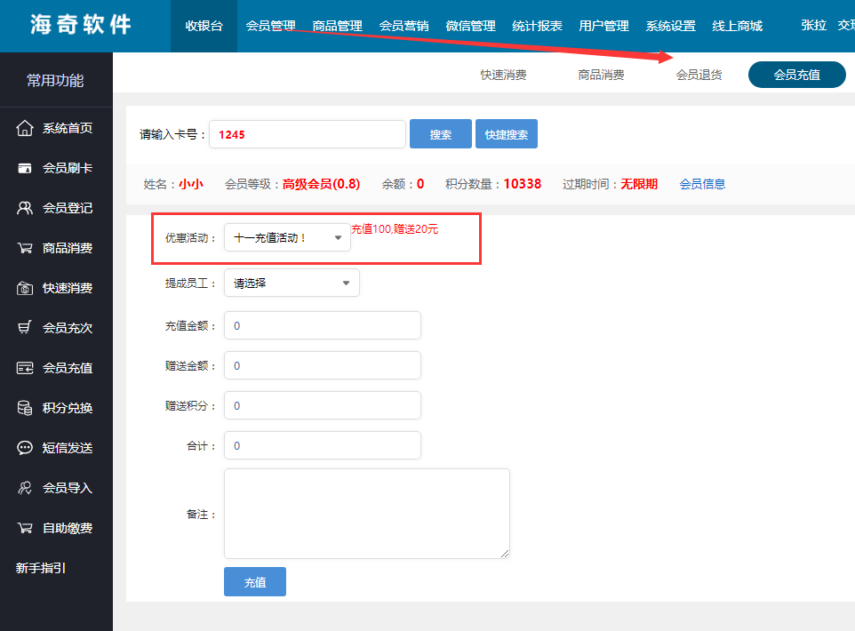 第二步:会员充值。点击:收银台—会员充值,选择优惠活动,充值100元,那么系统就会自动执行充值优惠活动,赠送20元。如图: