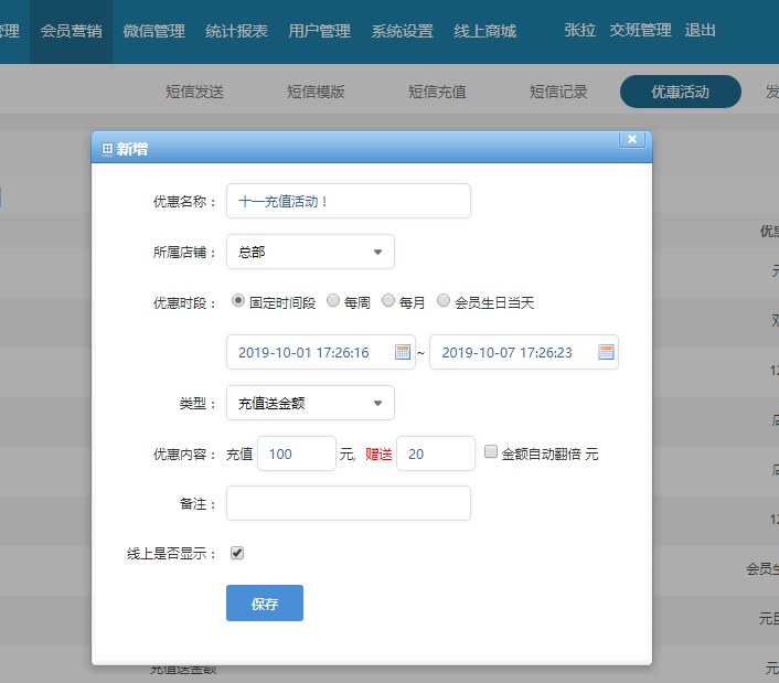 第一步:设置充值优惠活动。点击:会员营销—优惠活动,设置好充值赠送优惠活动,比如设置充值100赠送20元。如图:
