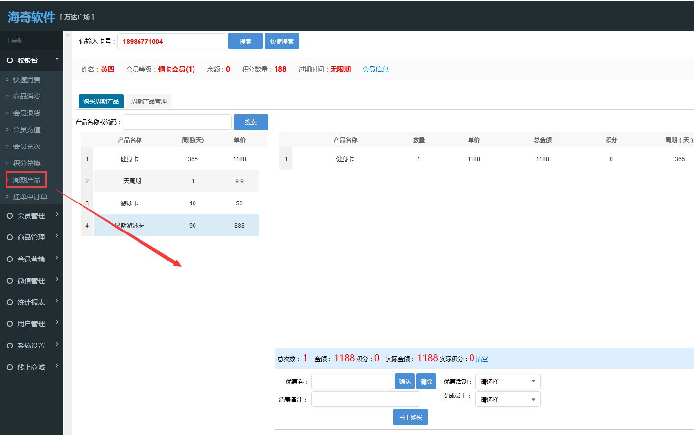 第三步:消费周期产品。周期产品消费,主要是起到两个作用:1.验证会员周期产品时间是否到期;2.形成周期产品消费记录 。