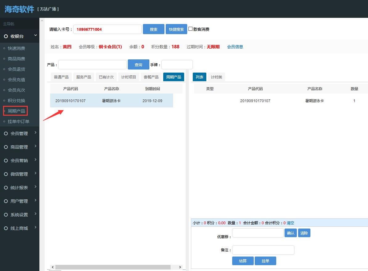 这既是海奇收银会员管理系统的周期产品功能,您是否有兴趣了解下呢?周期产品的一般应用服务行业较多,按时间周期计费的,比如健身房、游泳馆、儿童游乐场、书店、瑜伽馆、体育馆等,这行业的商家可以在线注册系统亲自去体验下此功能 。