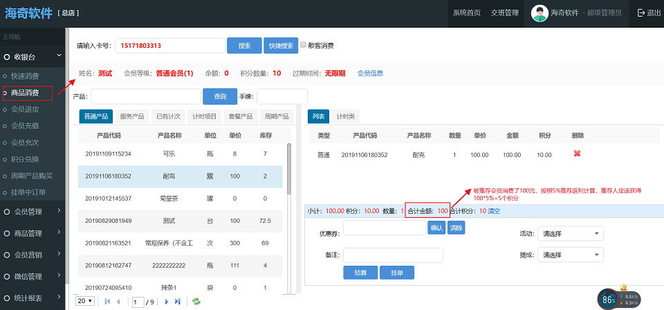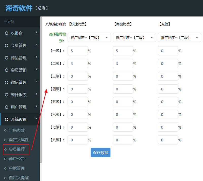 会员推荐返利是海奇会员管理系统一个非常强大而实用的功能,今天小编就来给大伙介绍一下操作流程: