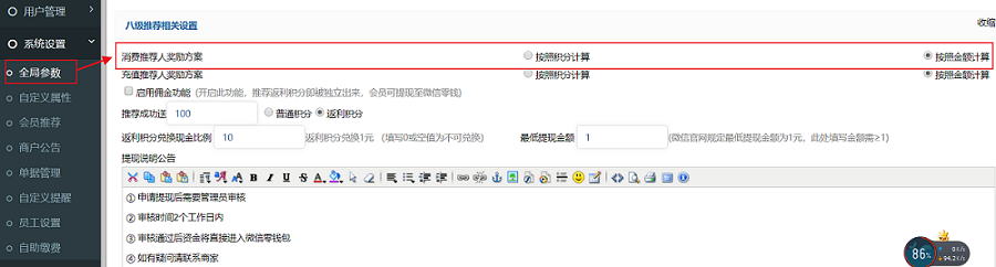 此处设置了:消费推荐人奖励方案,按照金额计算。比如消费100元,即一级会员返100*5%=5个积分。