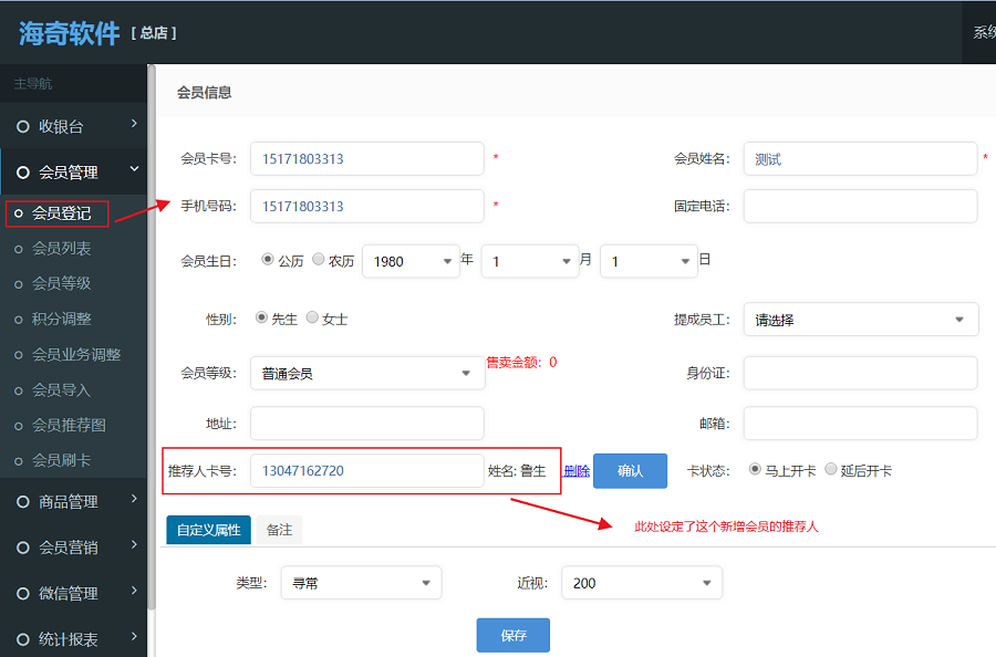 会员管理—会员登记,在推荐人卡号处填写推荐人卡号,并点确定。如图:
