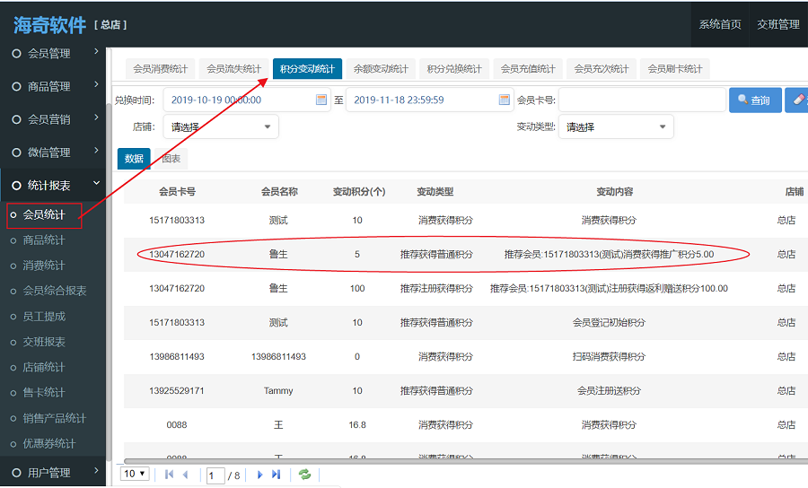 ②查看推荐人积分变化。统计报表—会员统计—积分变动统计,通过积分变动报表,我们就能够很清晰的看到推荐人的积分变化。如图: