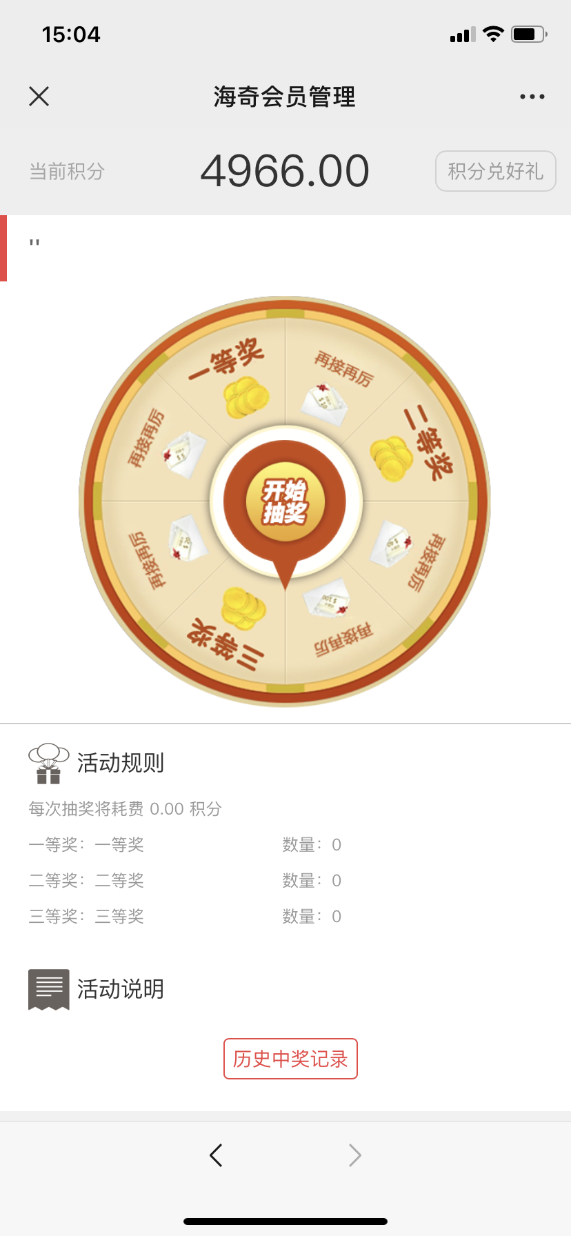 商家后台设置积分转盘游戏,可以设置1/2/3等奖,可设置每次玩转盘游戏所需积分,可以设置中奖概率等。如图: