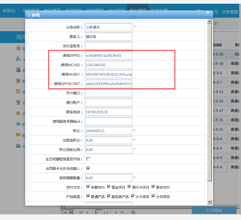 将记录下来的四个参数分别填写到海奇会员系统中相关位置:“用户管理/店铺管理”,选择店铺之后点击修改: