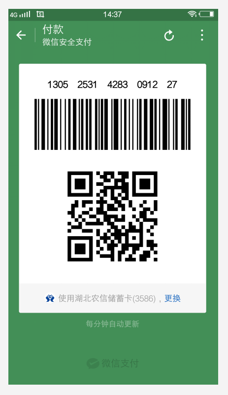 顾客消费时如用微信支付,需要顾客打开微信钱包,点击左上角“付款”,打开付款码: